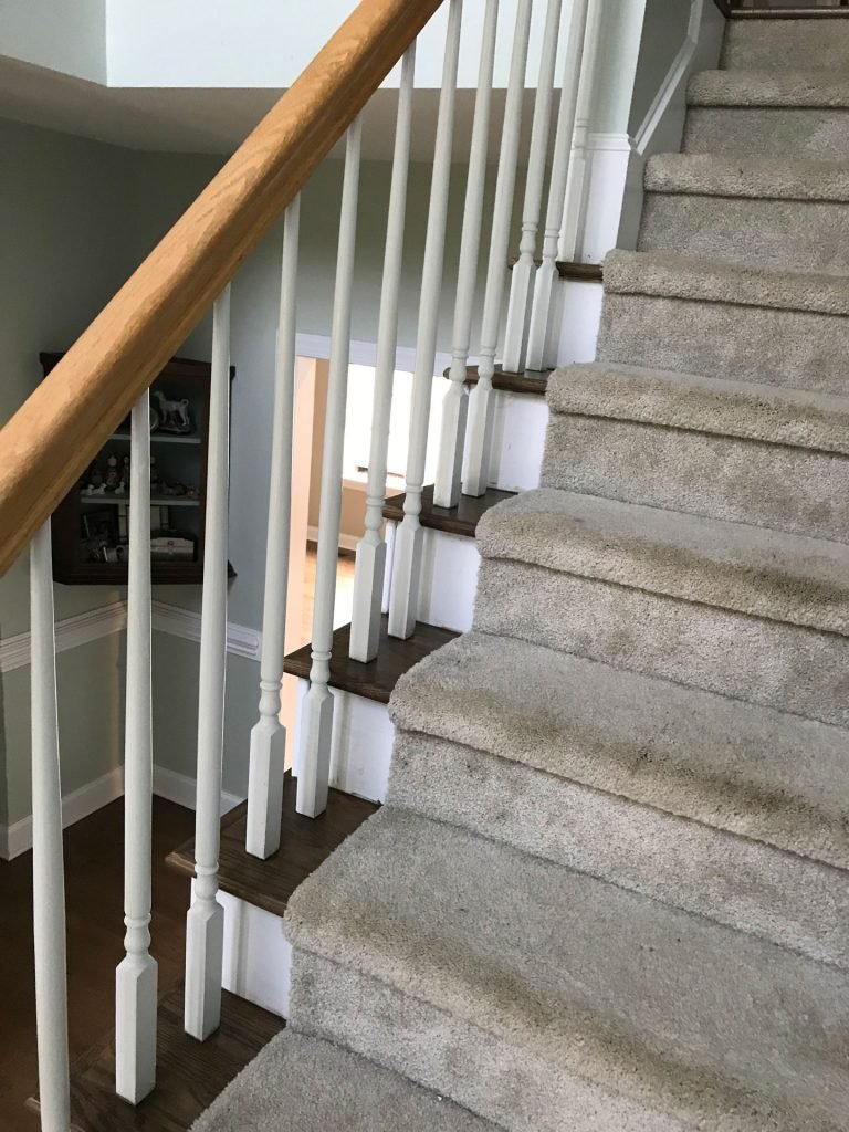 Removed carpet from Living Room and installed 3 1/4″ Red Oak. Sand and Finished entire downstairs with a mix of 50% Jacobean and 50% Classic Grey. Very classy looking stain color versus the old orange colored stain.