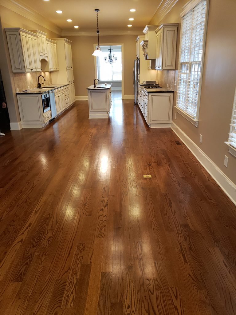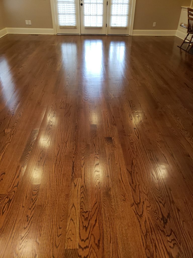 Recent buff & coat. Before picture shows what happens when an “off the shelf” product is used to mask whats underneath. Previous owner used a polish that eventually flaked off as it does not adhere to polyurethane. Thus, material needed to be devolved using this type of machinery to allow us a surface to buff and coat with a fresh coat of polyurethane.